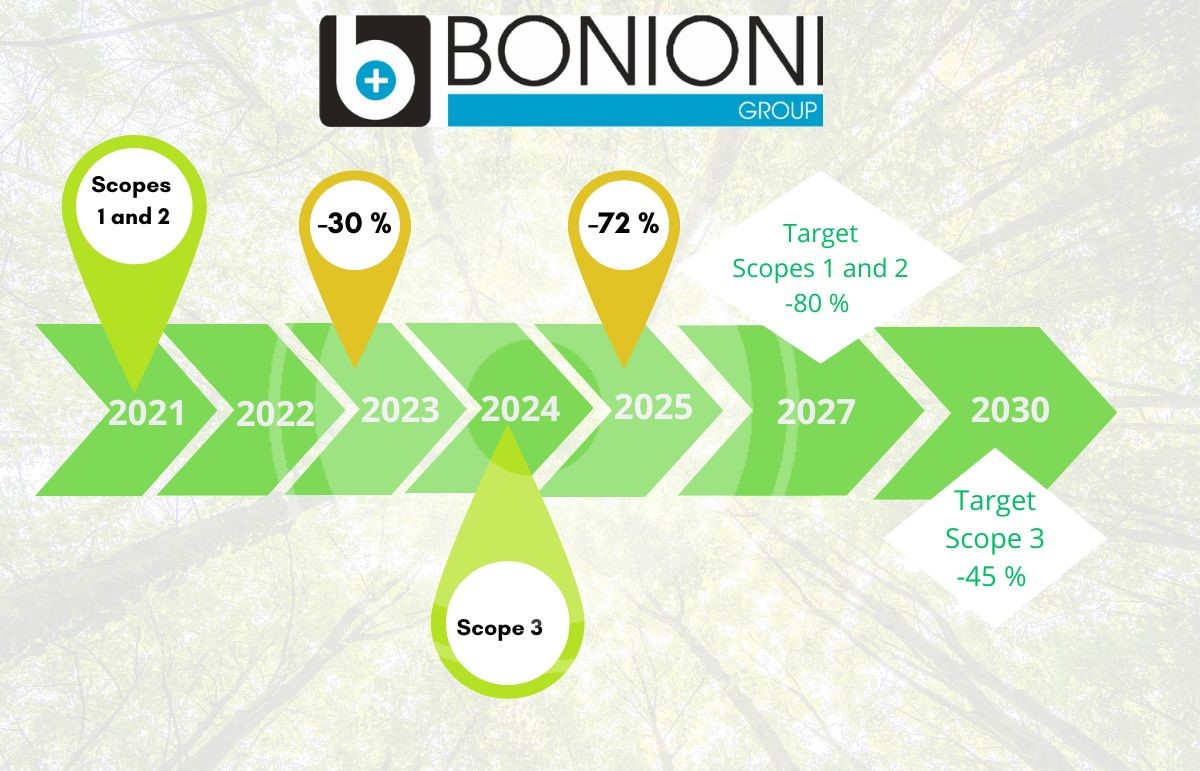 Aufgrund dieser Fortschritte hat sich die Bonioni Group ein neues Ziel für 2027 gesetzt, nämlich die ehrgeizige Reduzierung der CO2-Bilanz für Scope 1 und 2 um 80 % bis 2027.
