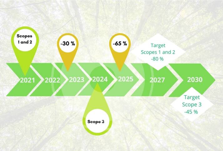 Die Berechnung von Scope 3 wurde 2024 mit dem Ziel einer Reduzierung der CO2-Emissionen um 45 % bis 2030 begonnen.